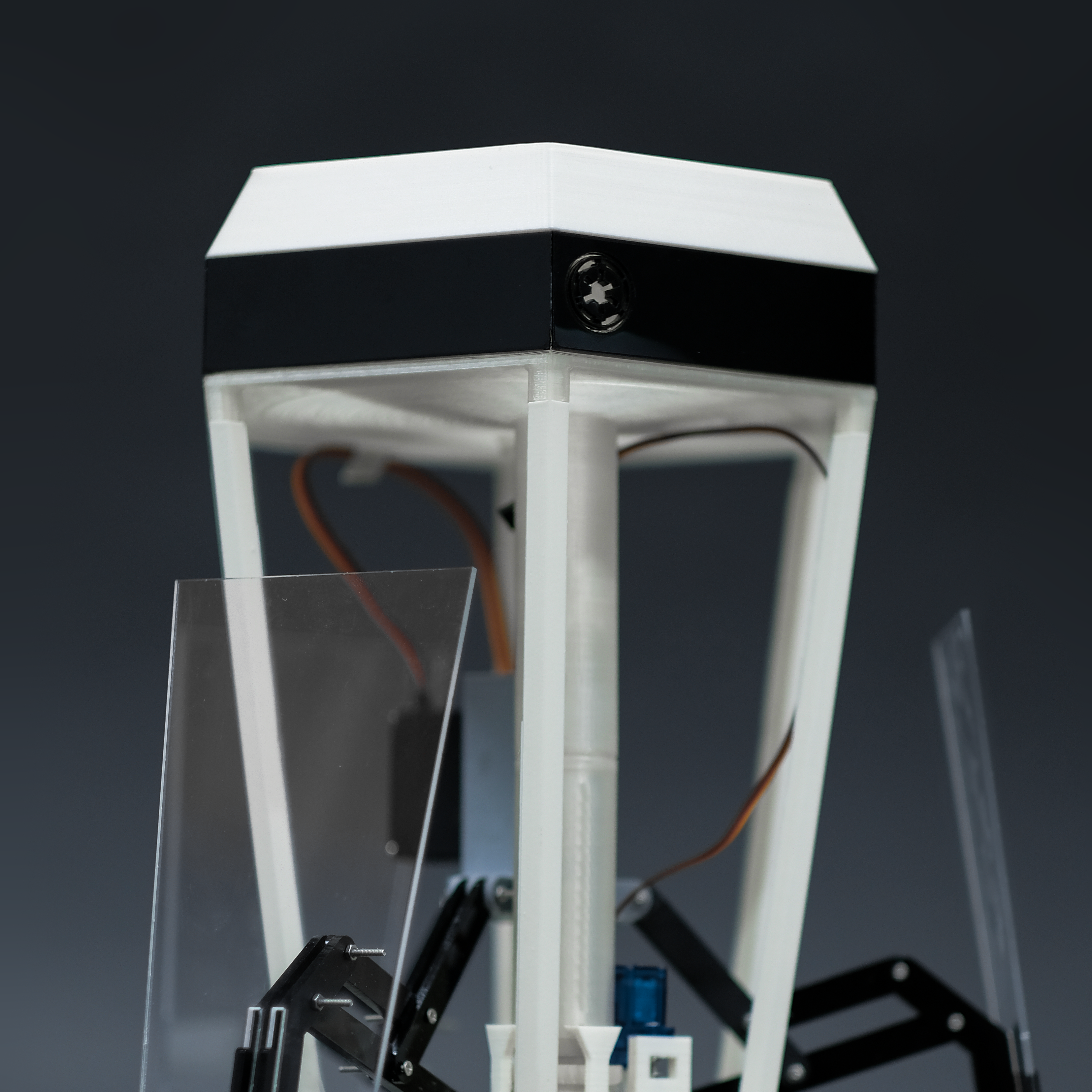 An angled enclosure funnels particulate into the binding chamber, supported by 3D-printed pillars that keep the structure light while maintaining balance and stability.