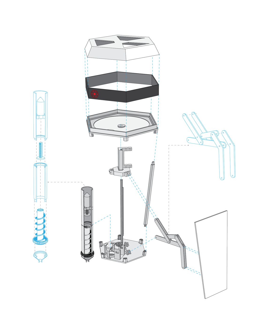 Early prototypes,CAD models, mechanical tests, and form studies were used to improve how the system moves, processes material, and assembles together.