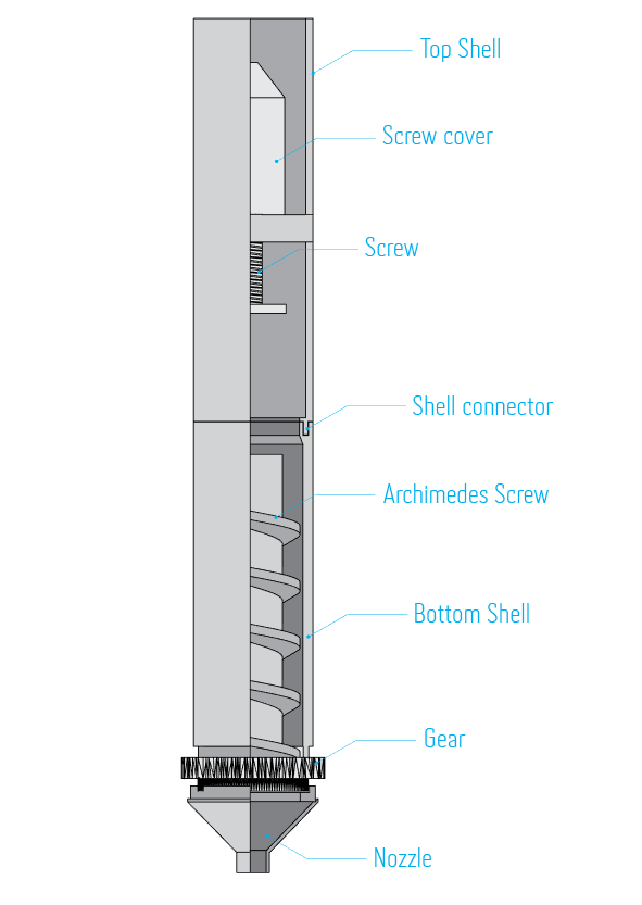 Final CAD integrates structure and a material chamber for mixing and extrusion.