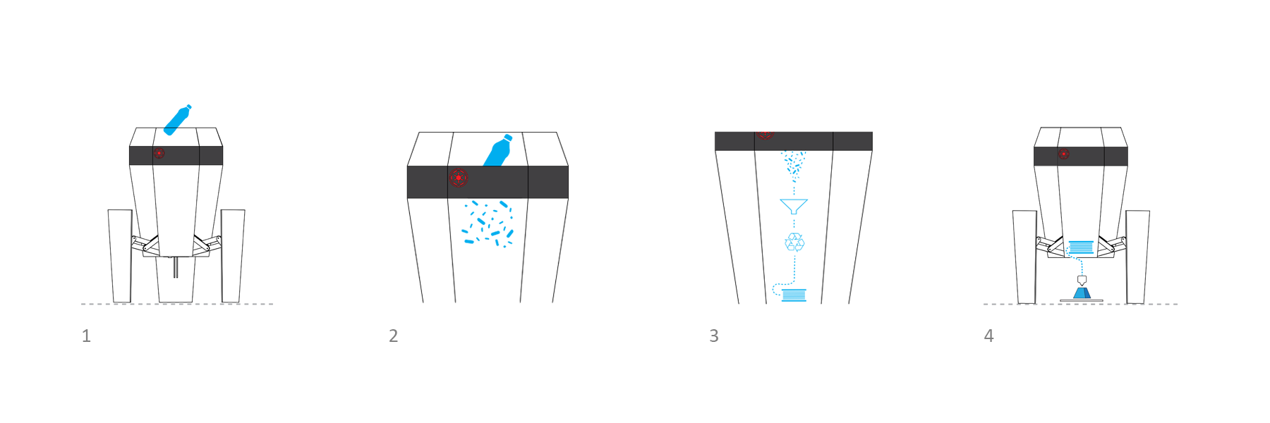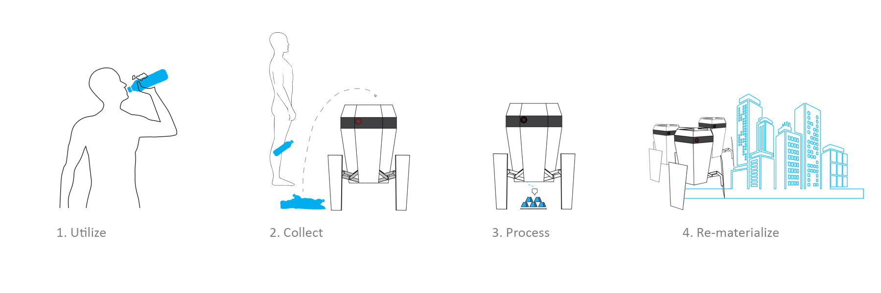 A four-step system that transforms everyday waste into new objects, infrastructure, or materials.