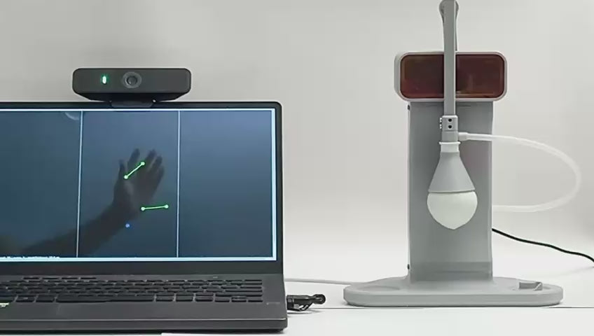 Hand gestures captured by a webcam are translated into robotic motion in real time. Lateral movement controls the arm’s position, while a pinch gesture activates the vacuum gripper to pick and place objects.